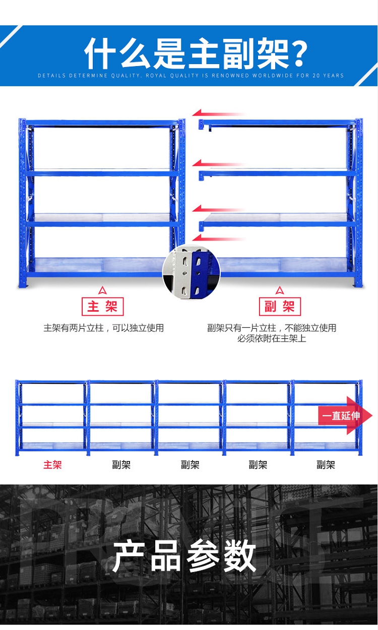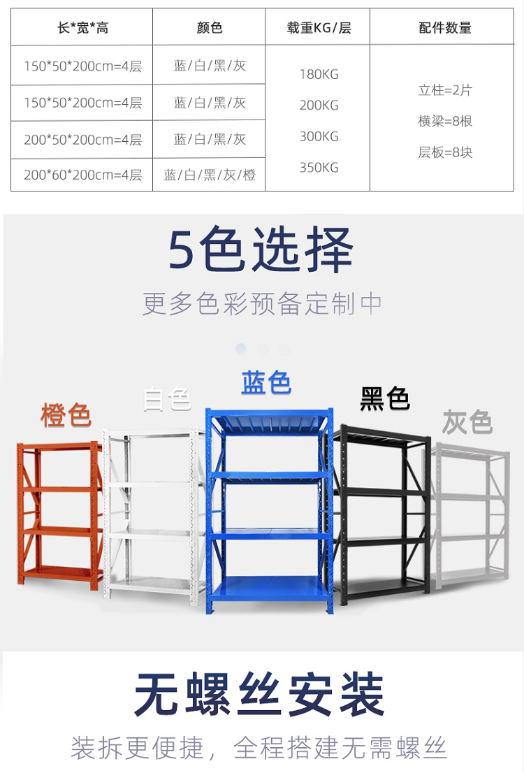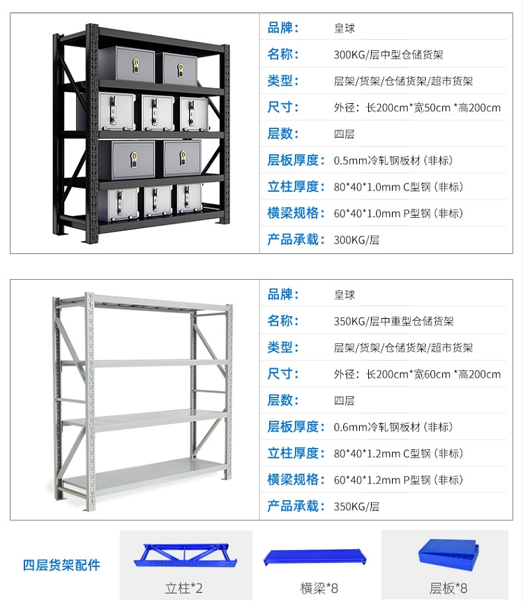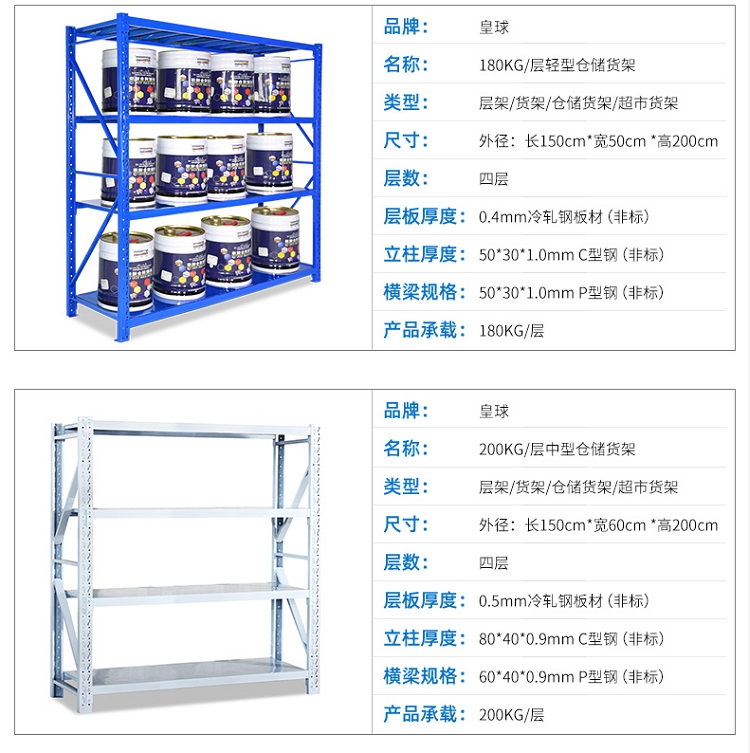 皇球 长200*宽50*高200cm 升级款四层主架 货架仓储轻型金属层架置物货架180kg/层 灰色(单位:个)