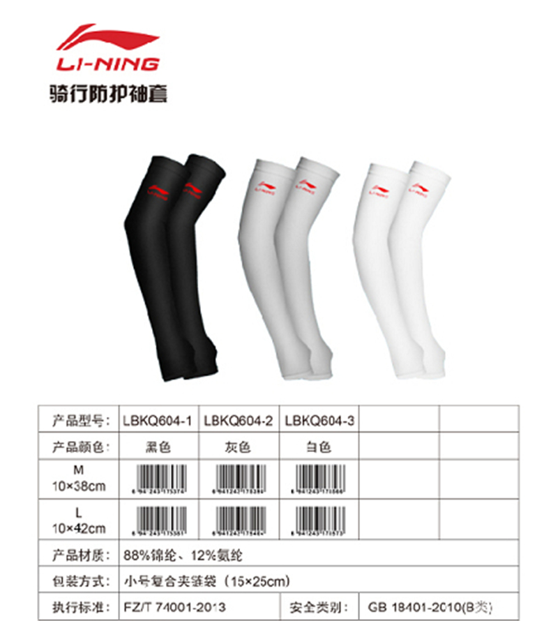 李宁冰袖冰丝袖套LBKQ604骑行防护套袖 夏季防晒紫外线款护臂户外颜色随机 (单位:双)