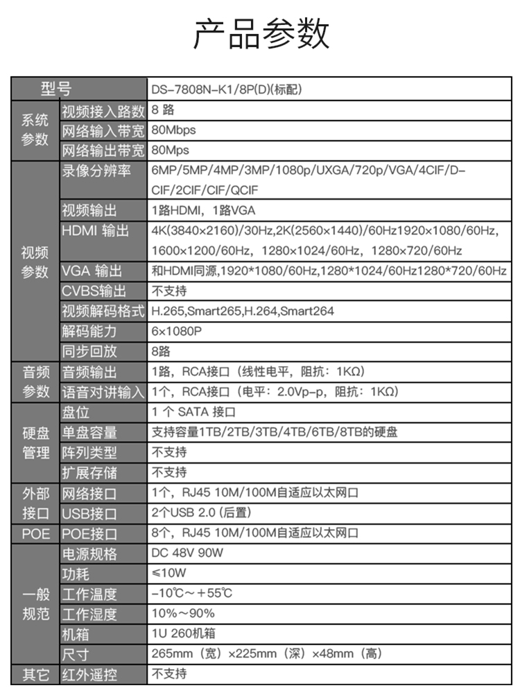 海康威视 DS-7808N-K1/8P 8路1080P高清监控录像机 POE供电 (单位:台)