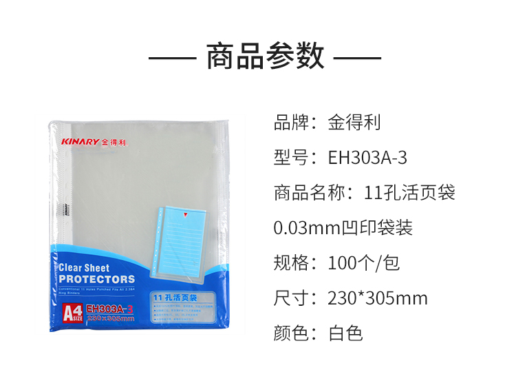 金得利 EH303A-3 11孔活页袋0.03mm凹印袋装 230*305mm 100个/包 白色 单位:包